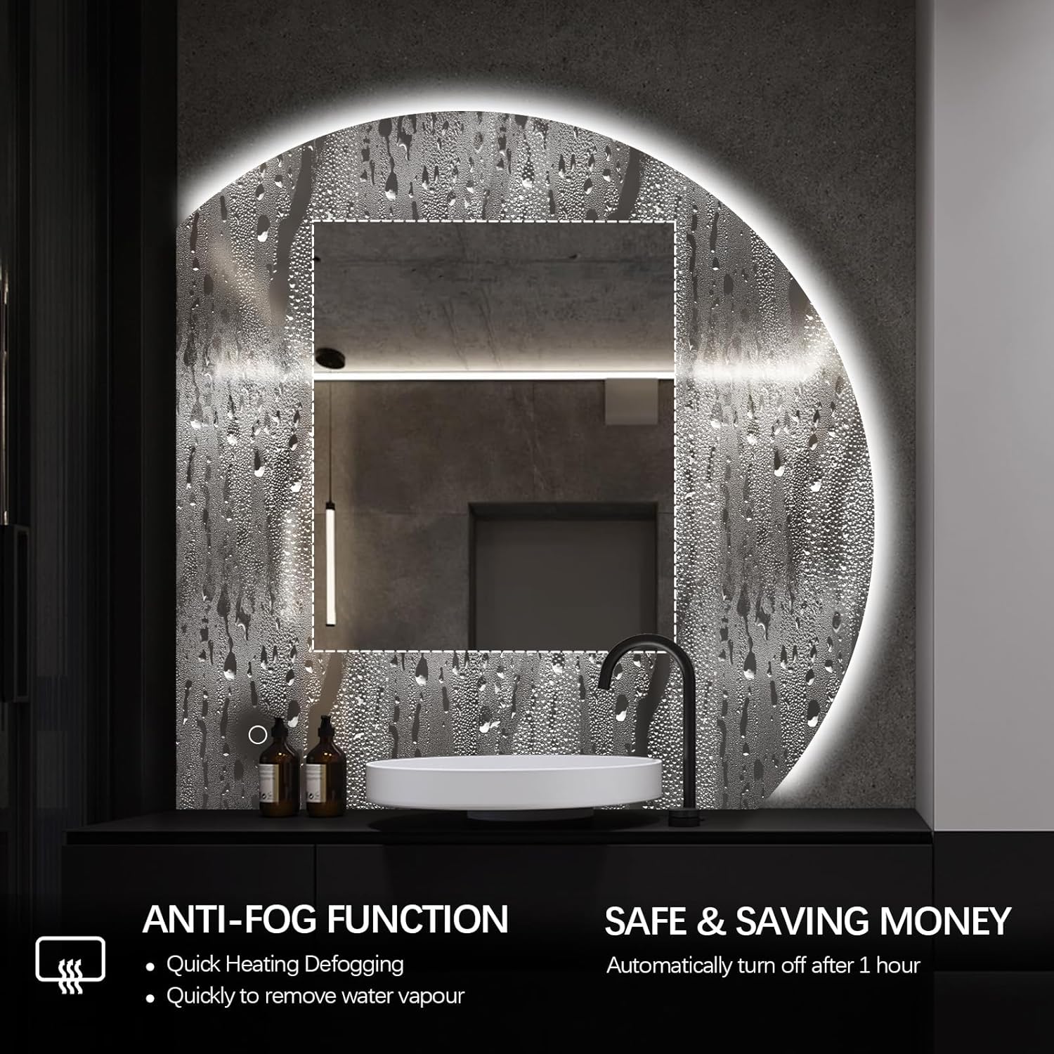 anti-fog function. The mirror remains clear and spotless, ensuring your reflection is always perfect. Crafted with a 5mm no-copper HD silver mirror, it provides