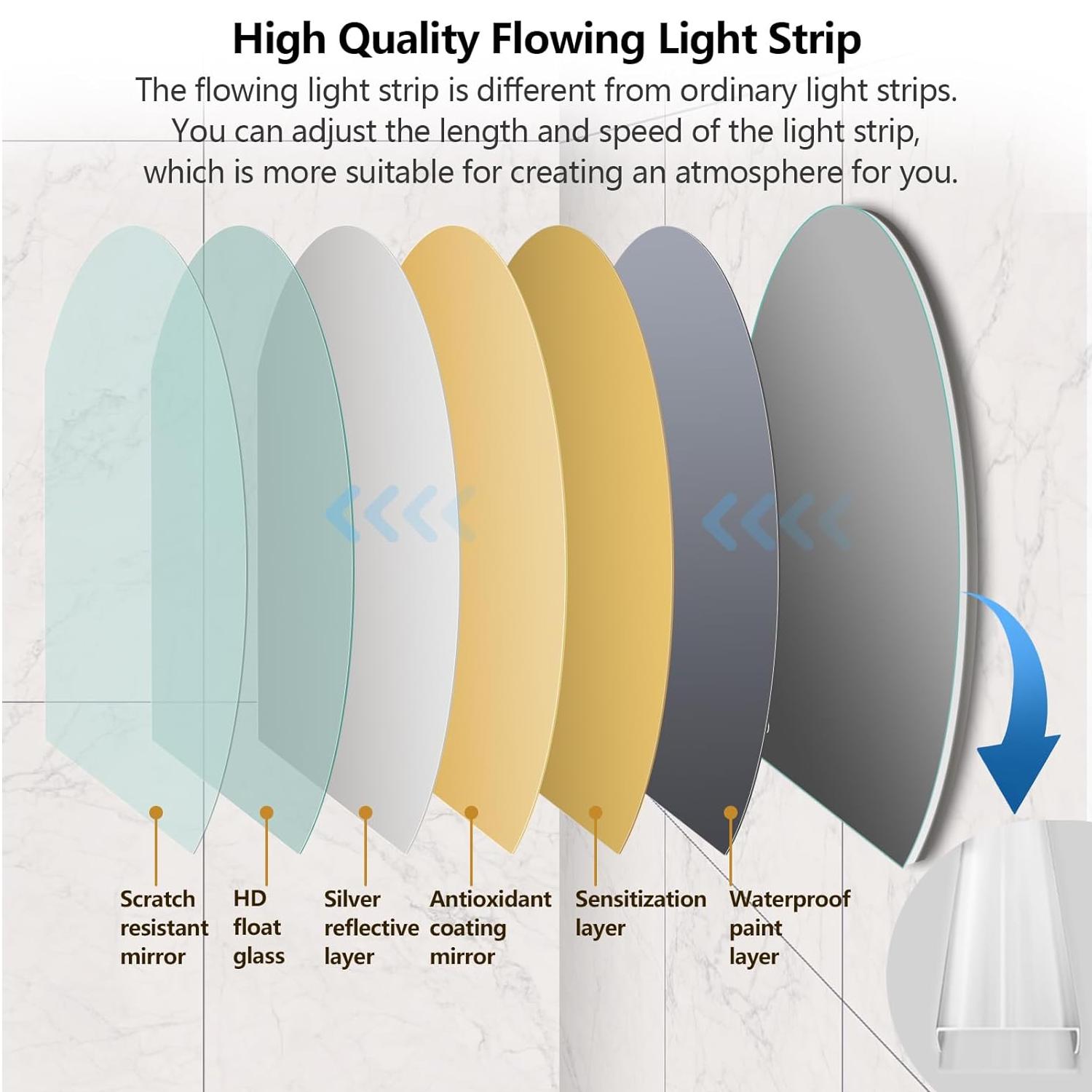 touch control system. Adjust the speed and length of the flowing water light to set the perfect ambiance. Choose from four speed settings — low, medium, high, or static — and customize the lighting length with a simple touch. The mirror automatically saves your preferred settings for future use.