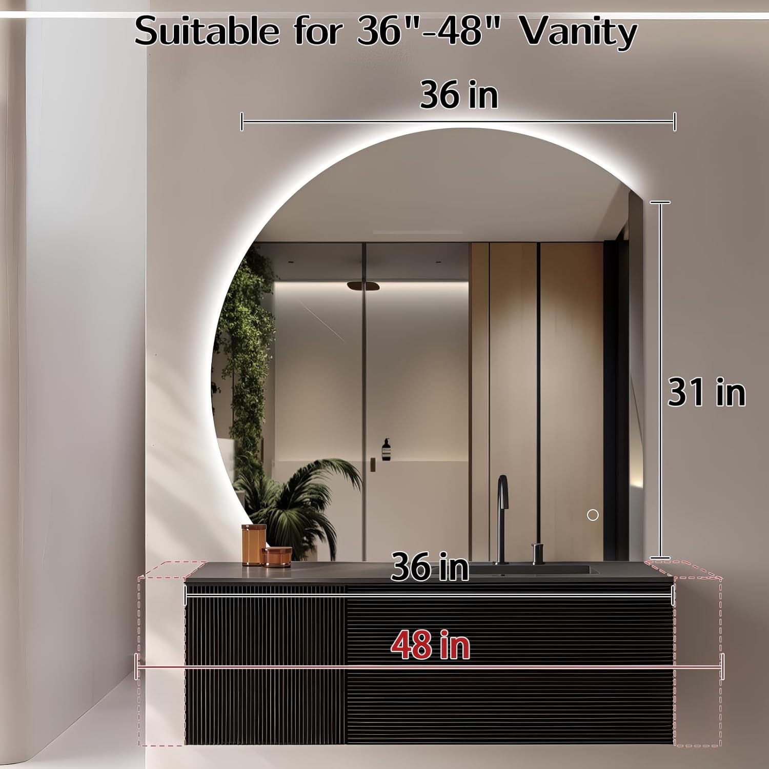 35-inch Half Moon LED Vanity Mirror — a perfect fusion of art and functionality. Designed in an elegant semi-circular fan shape, this mirror breaks away from the ordinary and adds a sophisticated touch to your bathroom, dressing room, or entryway. Its frameless design and soft backlit glow create a luxurious atmosphere, elevating your home décor to new heights.