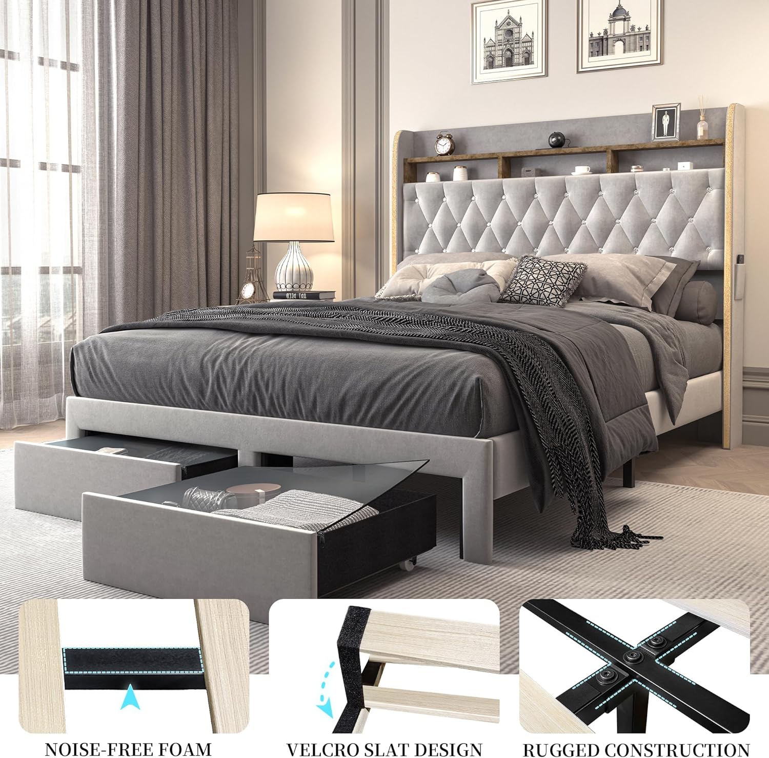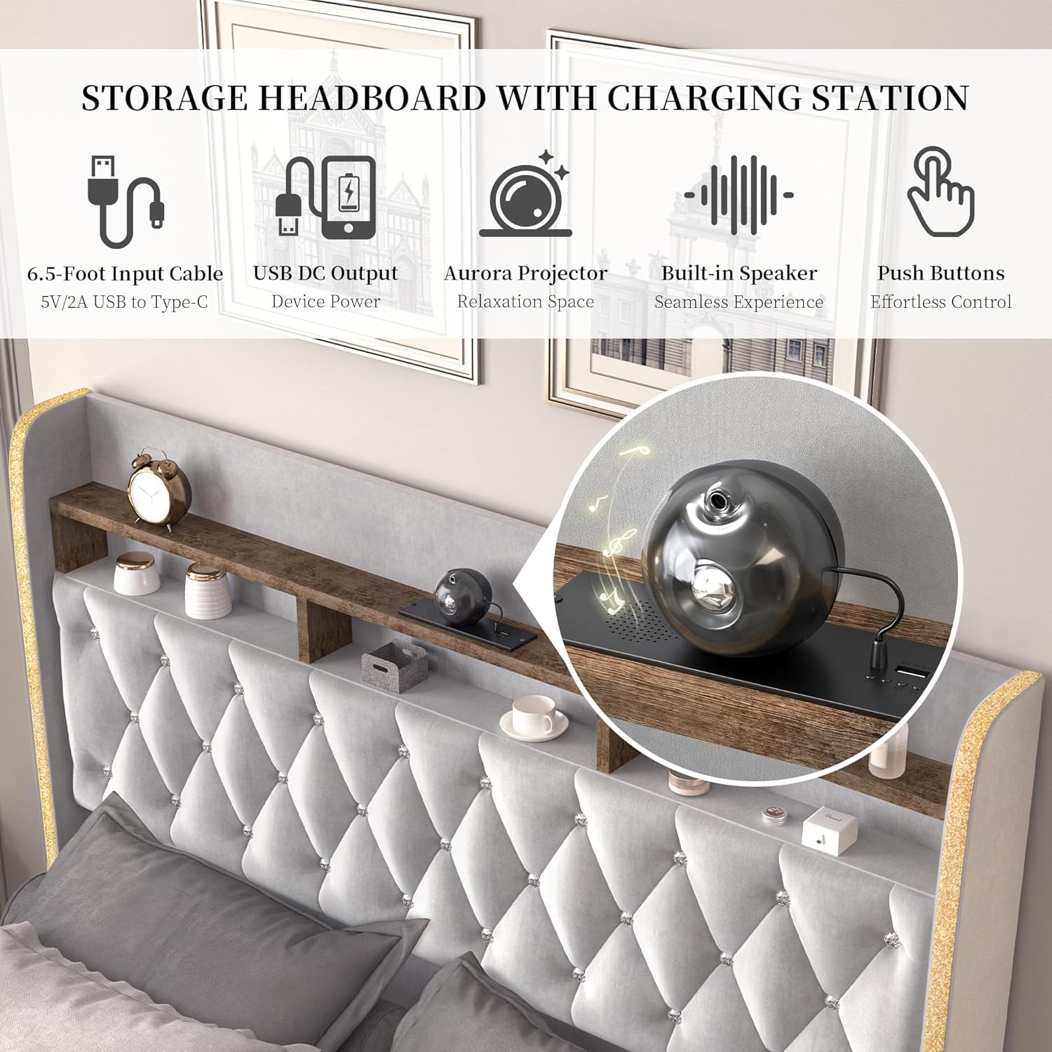 Queen LED Bed Frame with Storage Drawers, Velvet Upholstered Platform Bed with Galaxy Lights