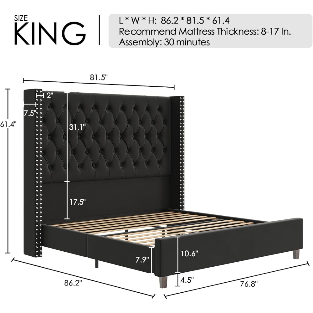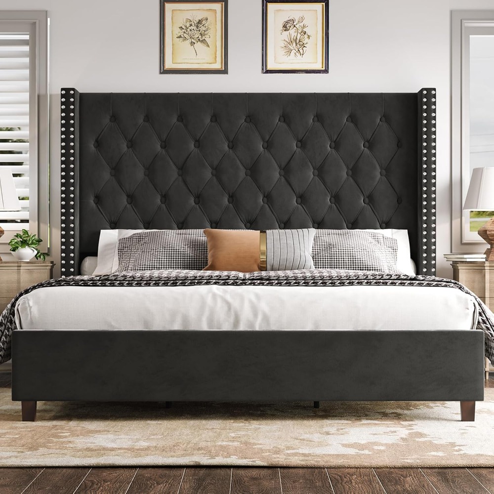 Elegant King Size Bed Frame with Tall Velvet Headboard. Order yours today and enjoy the luxury, comfort, and sophisticated design that will transform the way you experience sleep!