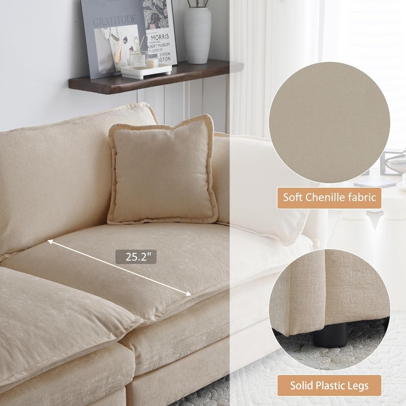The modern chenille fabric not only looks sophisticated but feels gentle and inviting to the touch. Each of the removable covers is designed for easy cleaning, ensuring a fresh, chic look over time. This sectional sofa features a deep seat (25.2 inches) and a supportive seat height of 19 inches, making it ideal for anyone seeking both style and comfort in their home furnishings. With its warm camel color and elegant finish, this sectional easily complements any decor, adding a touch of luxury and warmth to your space.