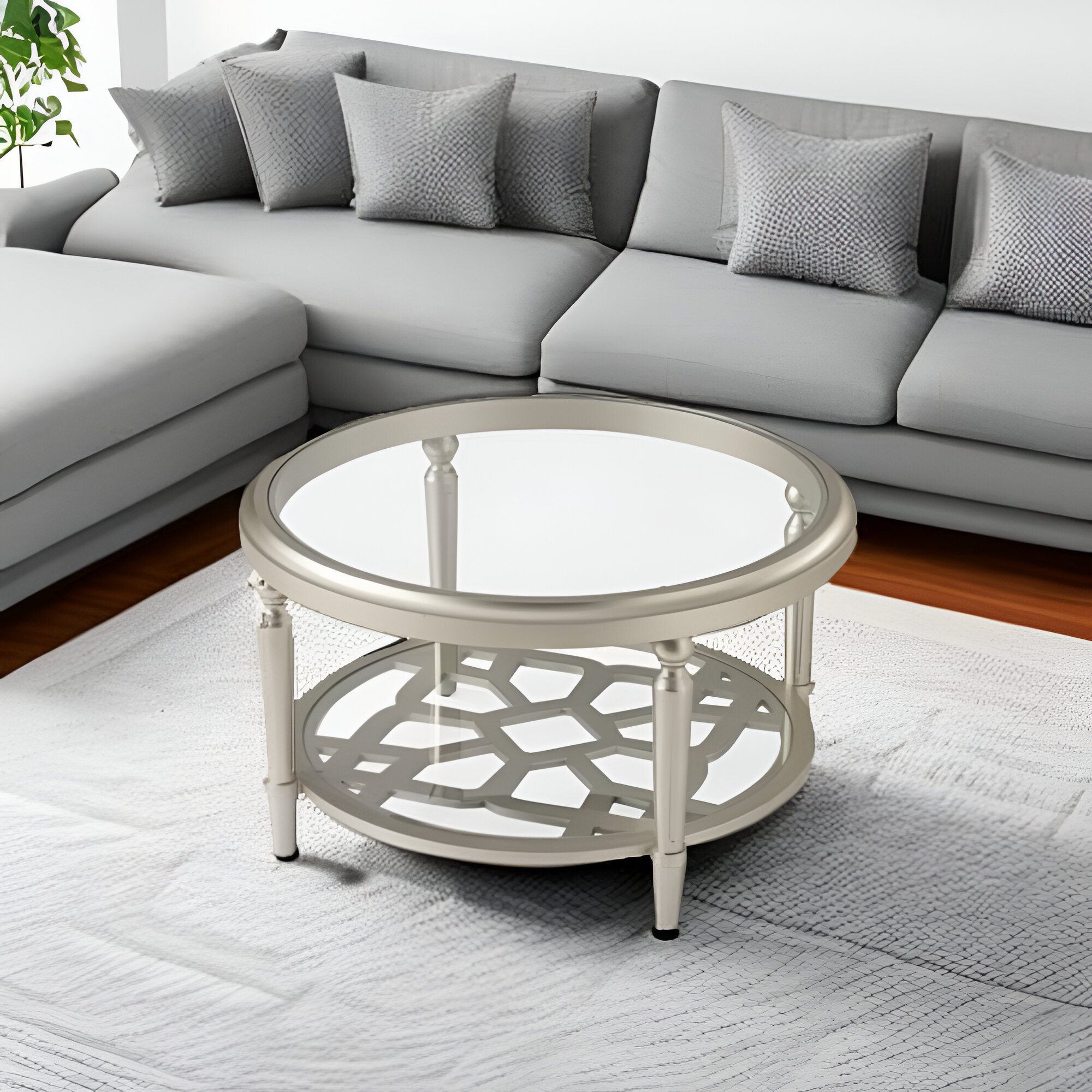Bring a touch of sophistication and modern charm to your home with this stunning 32" Round Glass Coffee Table. The clear glass top paired with the unique champagne finish offers an elegant look that perfectly complements any decor style. Designed with a sleek, minimalistic aesthetic, this table serves both as a statement piece and a functional storage solution. The table features a decorative 2-tier design, where the lower shelf showcases an intricate floral-geometric cutout pattern, adding a layer of detail and refinement to the piece.