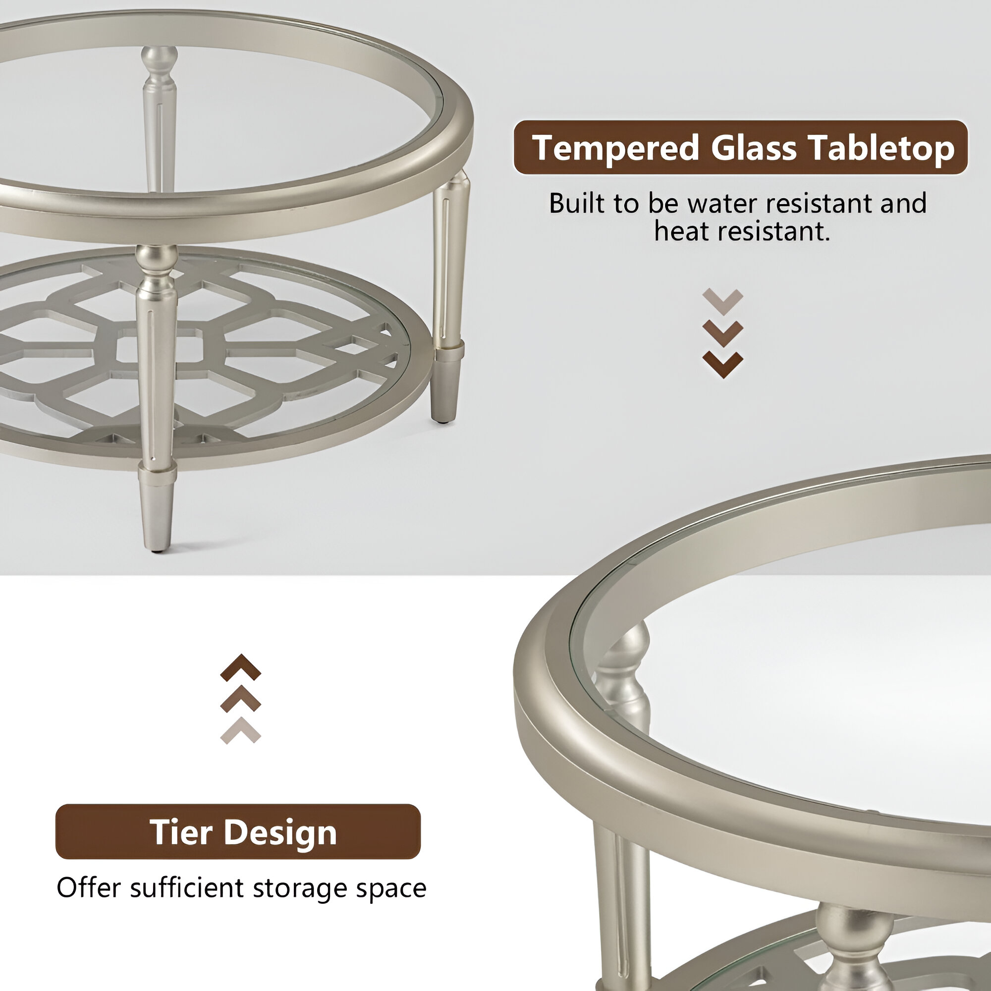 - Elegant Design: The sleek glass top and refined champagne finish bring a luxurious, modern look to your living room.