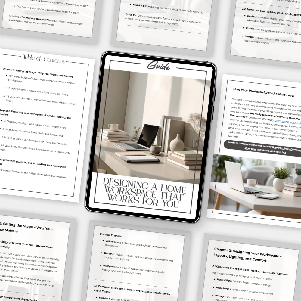 Designing a Home Workspace That Works for You is your ultimate digital guide to building a personalized, efficient, and comfortable area for working from home. Whether you’re an entrepreneur, freelancer, or remote professional, this beautifully crafted guide walks you through every step of creating a workspace that boosts productivity, supports focus, and reflects your unique style. From lighting layouts to furniture choices and AI tools, this resource blends practical advice with creative inspiration.