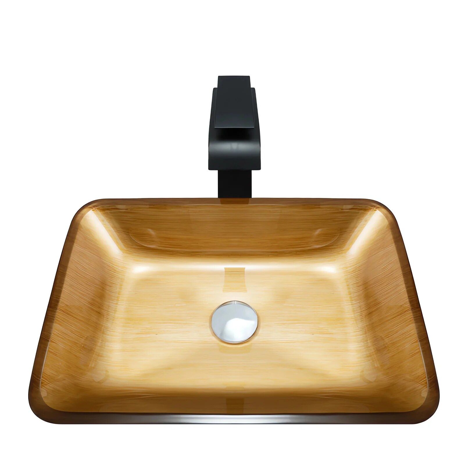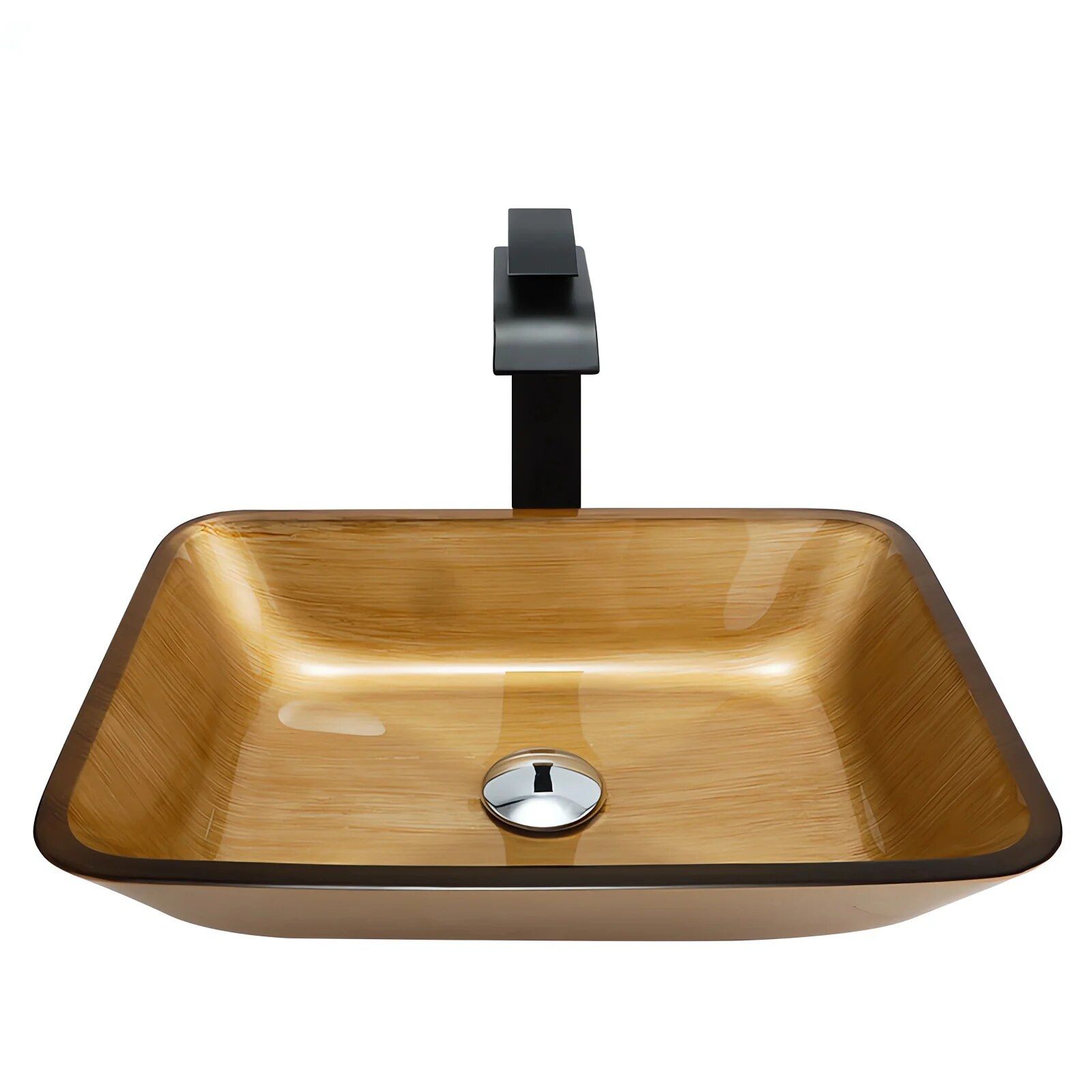 Introducing our exquisitely designed Rectangular Tempered Glass Bathroom Sink, a true embodiment of modern elegance and functional art. Crafted to transform your bathroom into a sanctuary of style, this sink is more than just a utility; it's a statement piece. Its wood grain gold detailing and sleek rectangular form will elevate the ambiance of your space, creating a luxurious feel in your daily routine.