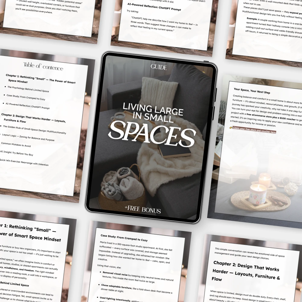 Discover how to turn every square foot into a sanctuary with Living Large in Small Spaces — the ultimate digital guide designed to help you rethink, redesign, and truly enjoy your compact home. Whether you’re living in a studio apartment, tiny home, or shared space, this guide gives you practical strategies and creative inspiration for what to do when home space is limited. From smart design principles to AI-assisted decluttering, this beautifully written resource helps you unlock potential where you least expect it.