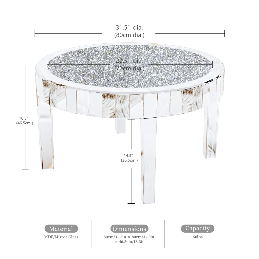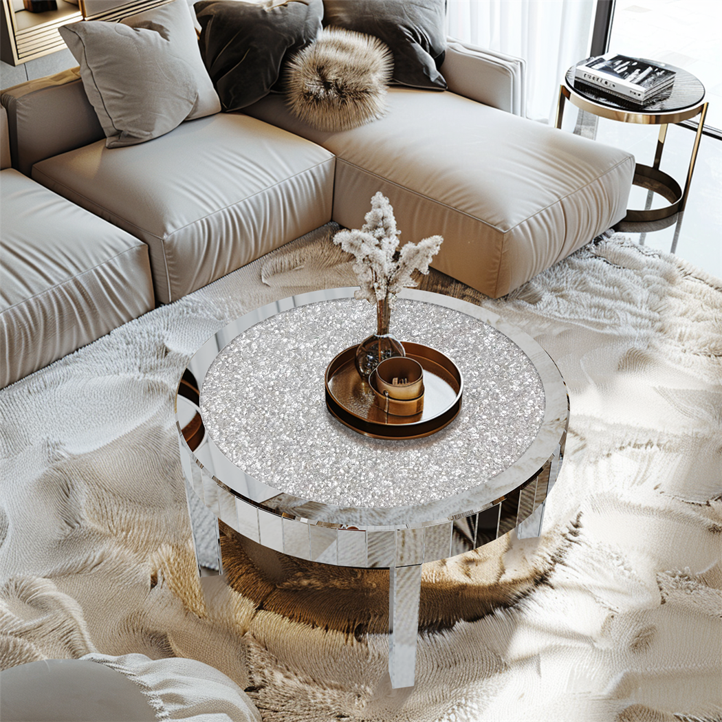 With its sleek round shape and shimmering silver finish, this coffee table blends seamlessly with modern, contemporary, and minimalist interiors. The durable MDF frame and glass panels offer strong support while maintaining a refined appearance. Measuring approximately