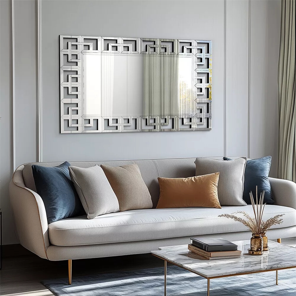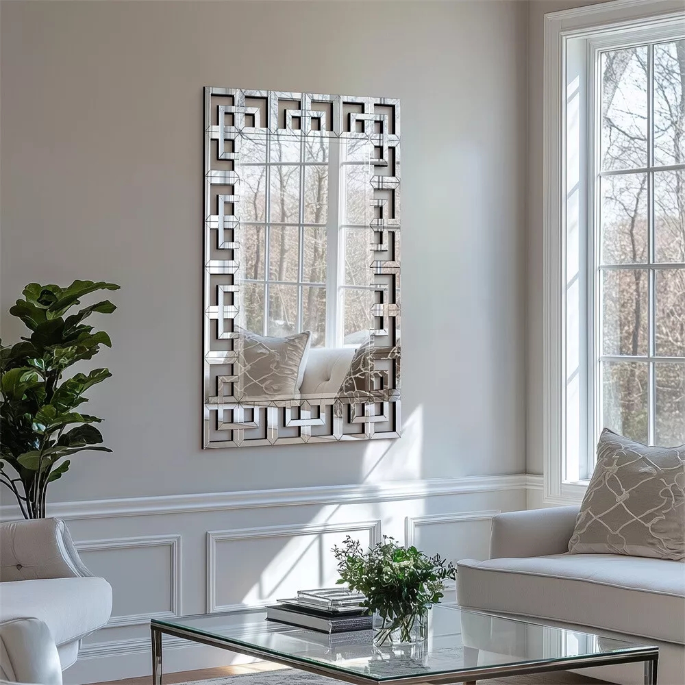 Bring sophistication and modern charm to any room with this stunning Grecian Venetian Wall Mirror. Measuring 48 inches by 28 inches, this rectangular accent mirror is designed to make your living room, hallway, or bedroom feel more spacious, bright, and inviting. Its minimalist modern design and sleek silver finish create a luxurious statement piece that effortlessly complements contemporary, classic, or transitional interiors. Crafted from high-quality glass, this mirror is not only visually striking but also durable and easy to maintain. The reflective surface adds depth to your room while enhancing natural and artificial light, instantly transforming your space into a more open and vibrant environment. Perfect for placing above a console table, sofa, or dresser, this mirror combines style and function in one elegant package.