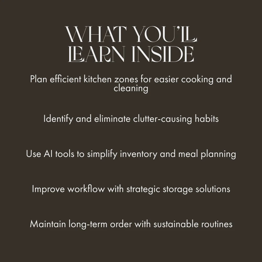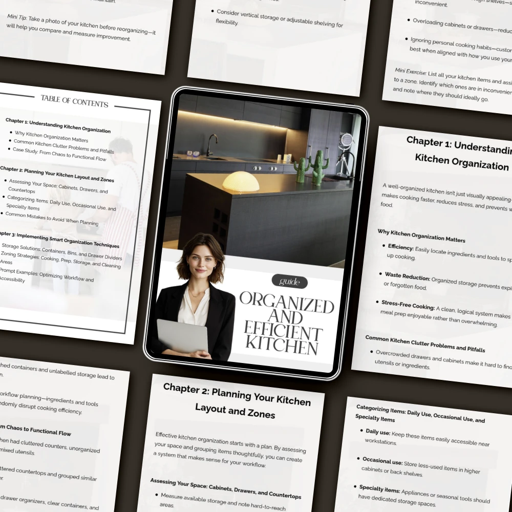 Unlike generic organization checklists, Organized and Efficient Kitchen blends timeless design principles with cutting-edge AI solutions. You’ll not only learn to organize your kitchen—but to maintain it effortlessly with the help of technology and thoughtful planning.