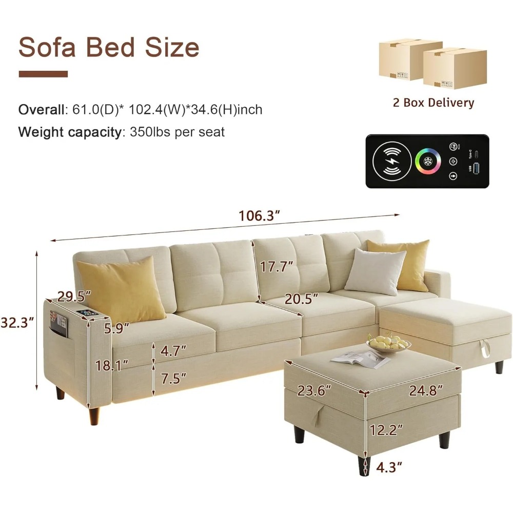 Stay connected without leaving your seat. This sectional comes with a built-in wireless charging pad, a USB port, and a Type-C port, so your devices stay powered as you unwind. Two spacious storage ottomans and convenient side pockets keep your essentials close and your space clutter-free.