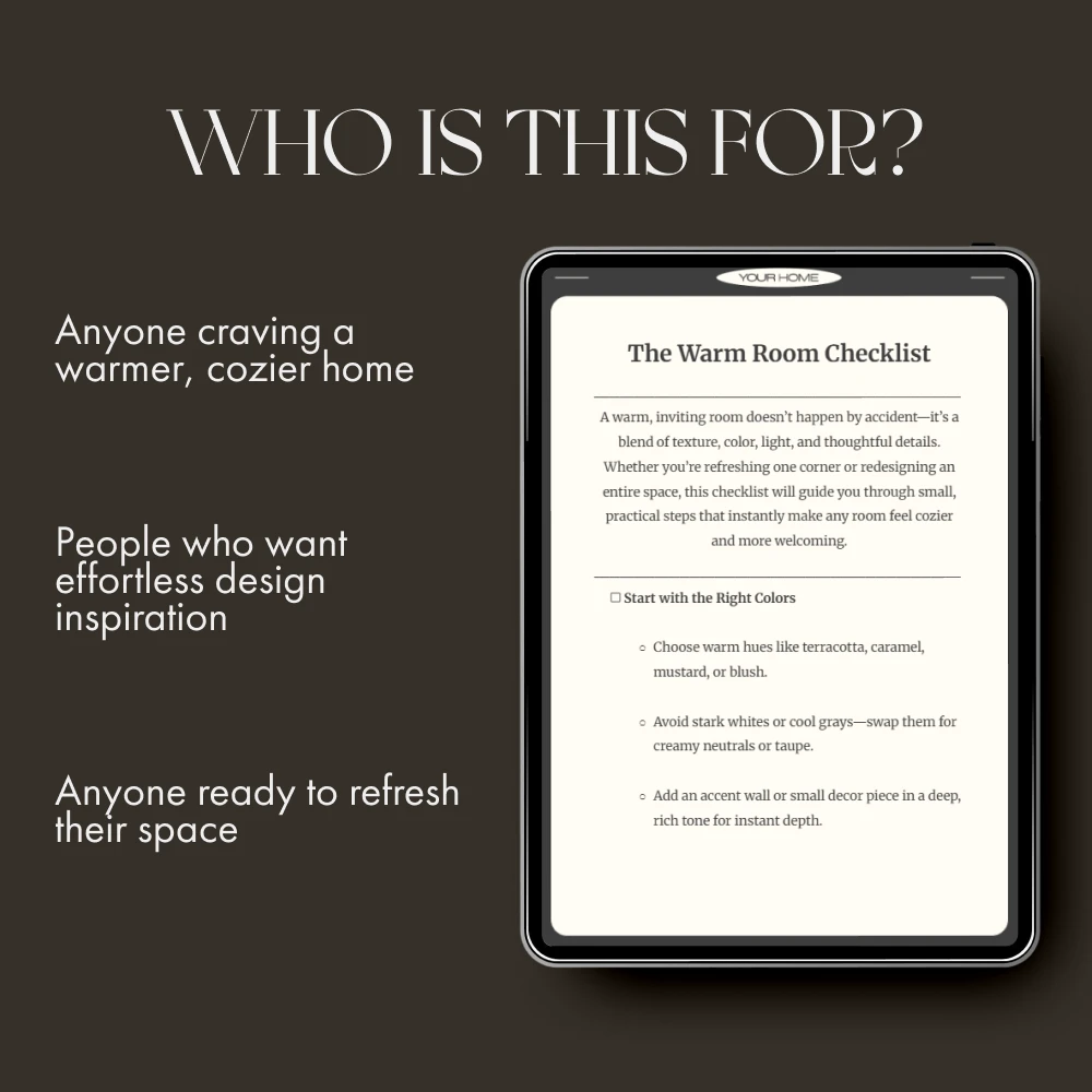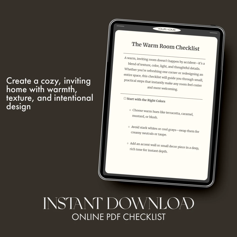 Turn your chilly or uninviting room into a sanctuary of warmth with The Warm Room Checklist—a beautifully designed, easy-to-follow digital download that teaches you how to make a room feel warmer. Whether you’re styling a new apartment, refreshing your bedroom, or enhancing your living room’s comfort, this guide helps you layer warmth, light, and texture effortlessly. No design degree required—just simple, thoughtful steps to create a space that feels as good as it looks.