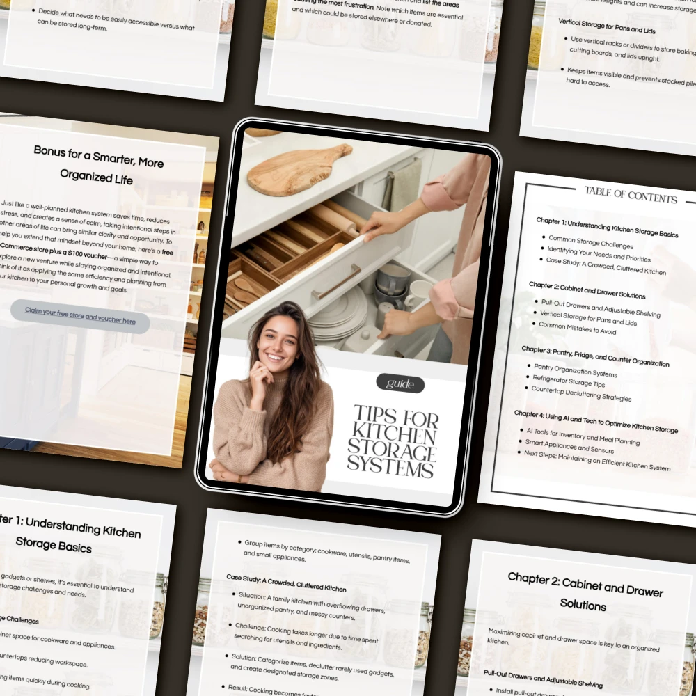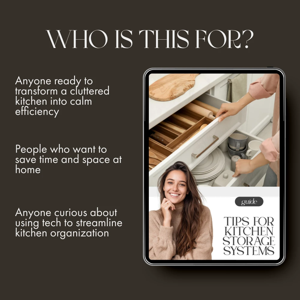 Tips for Kitchen Storage Systems—a comprehensive digital download designed to help you reclaim your kitchen and streamline your daily routine. Whether you’re a busy home cook, a new homeowner, or someone looking to modernize your kitchen, this guide blends practical organization strategies with cutting-edge technology to create a kitchen that truly works for you.