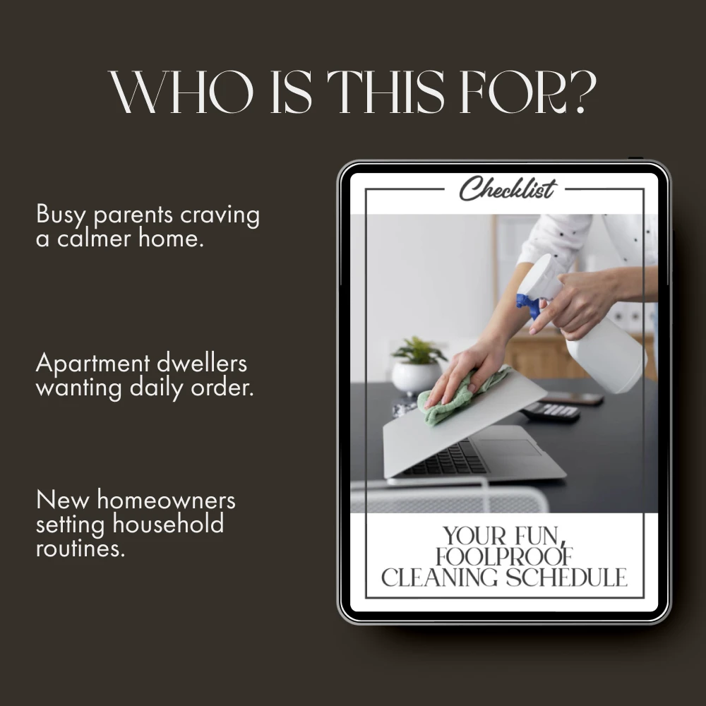 Stop feeling buried under laundry piles and start enjoying a home that shines on autopilot. Download Your Fun, Foolproof Cleaning Schedule Checklist now and discover how to create a cleaning schedule that works—one that fits your life, not the other way around. Turn your to-do list into a “done” list and make cleaning feel easy, satisfying, and even a little fun!